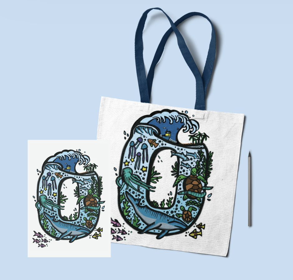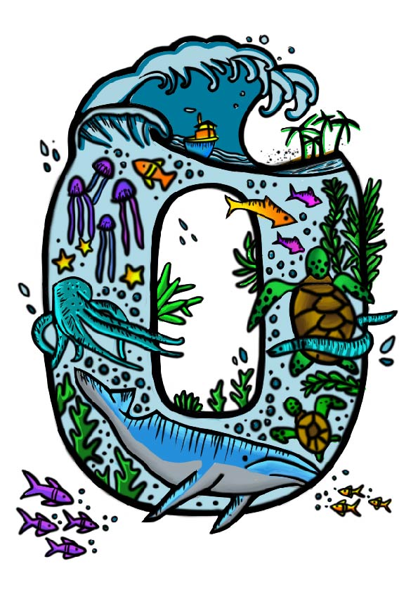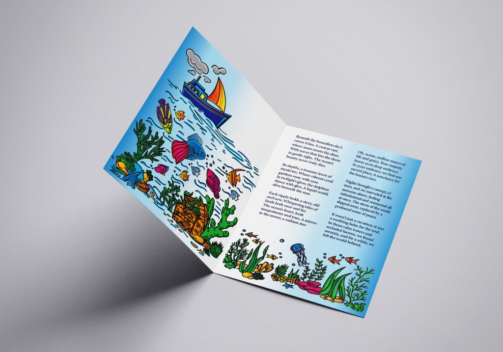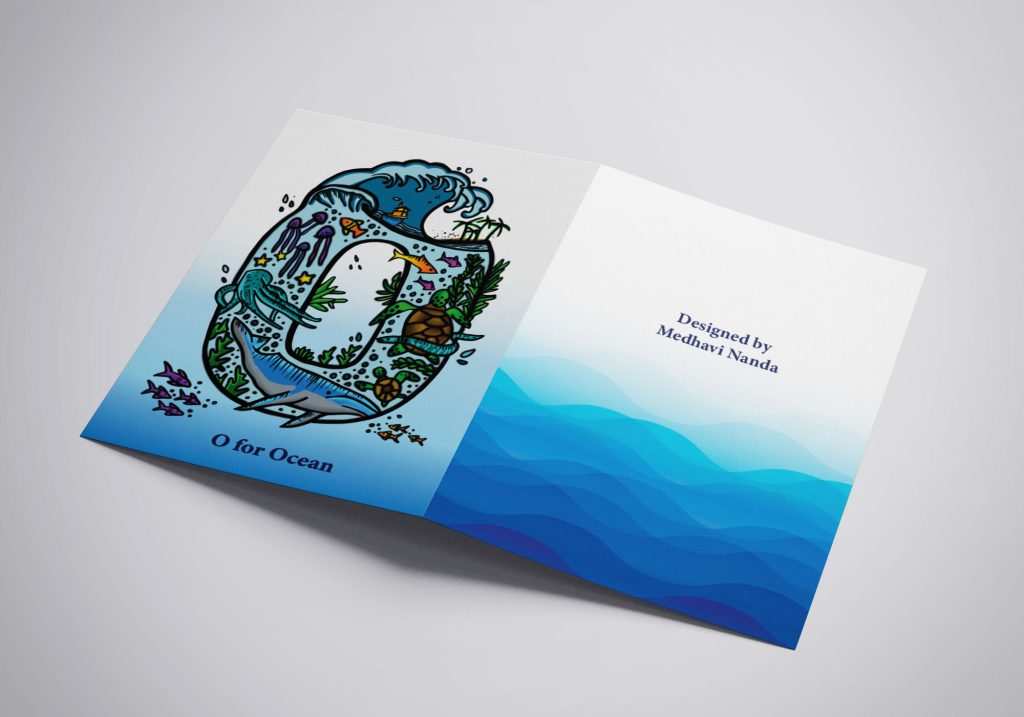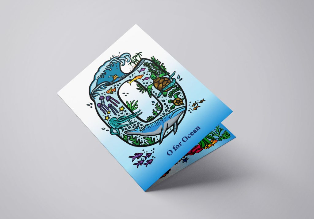 A bi-fold design featuring an illustration of the letter “O,” representing the ocean