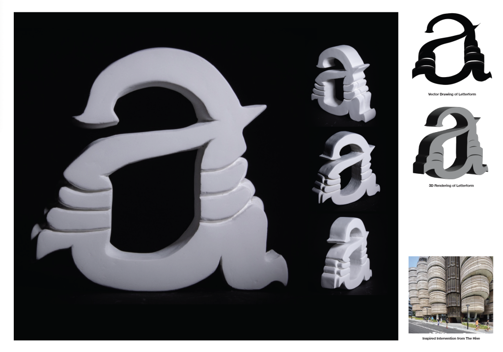 A spatial typography study using blue foam and plaster to create a 3D letterform inspired by NTU’s “The Hive.”