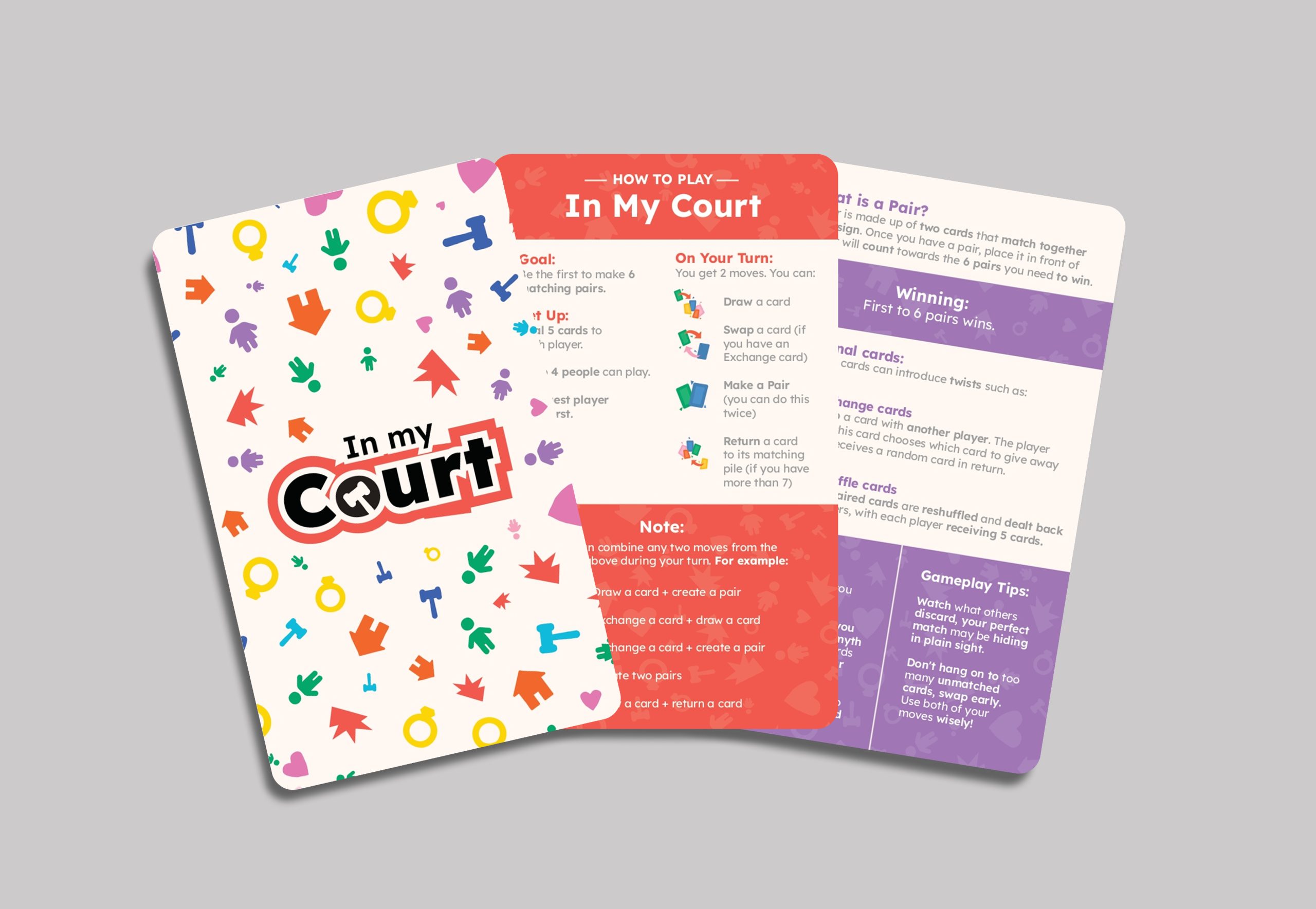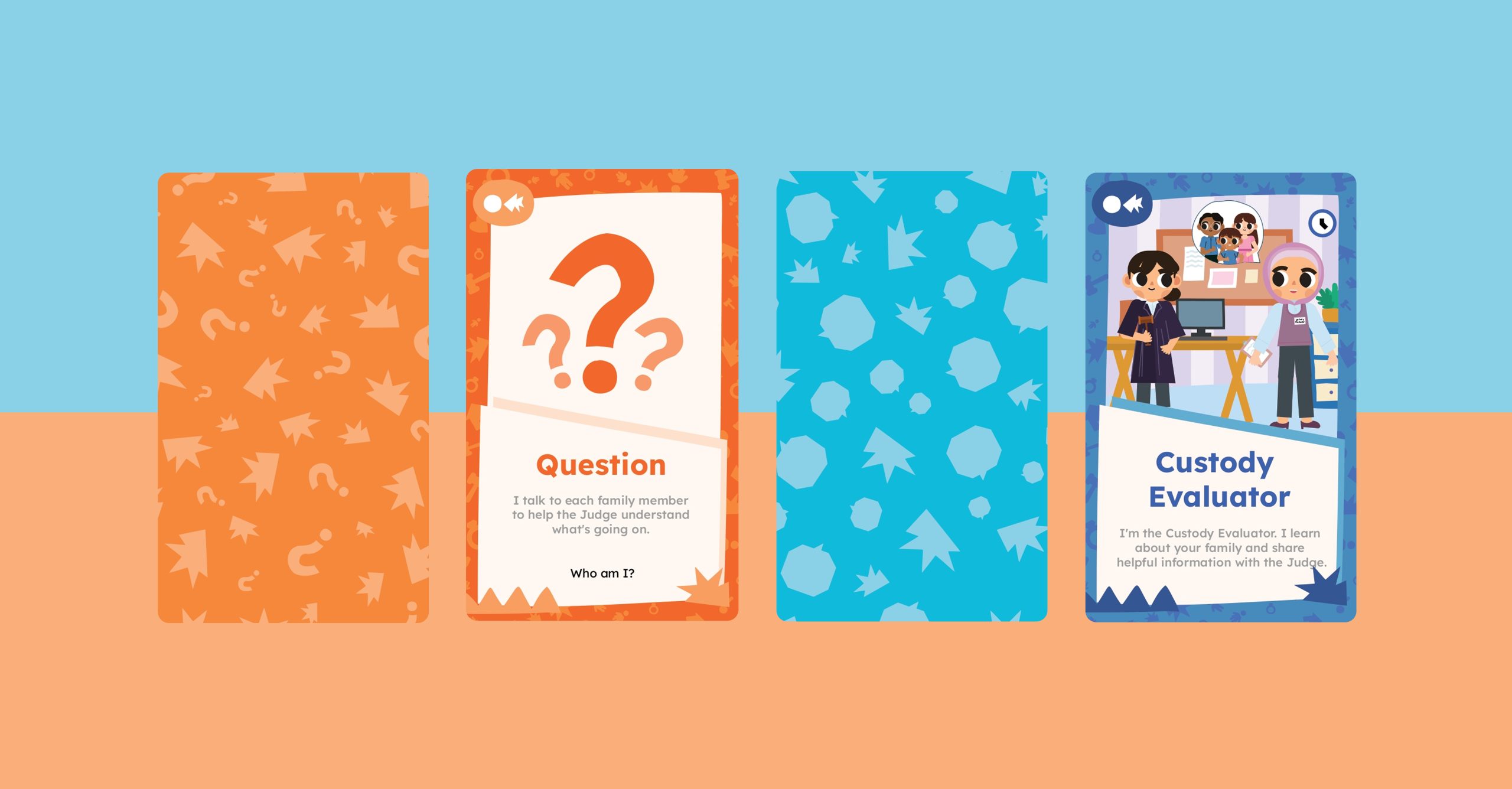 Divorce proceedings can be confusing and emotionally overwhelming for children. The concept behind In My Court was to transform this difficult subject into a playful and supportive learning experience. By using bright illustrations, relatable characters, and simple mechanics such as pairing cards, the game introduces children to key figures in the court system, such as judges and social workers, while also addressing common myths, facts, and emotions surrounding family separation.