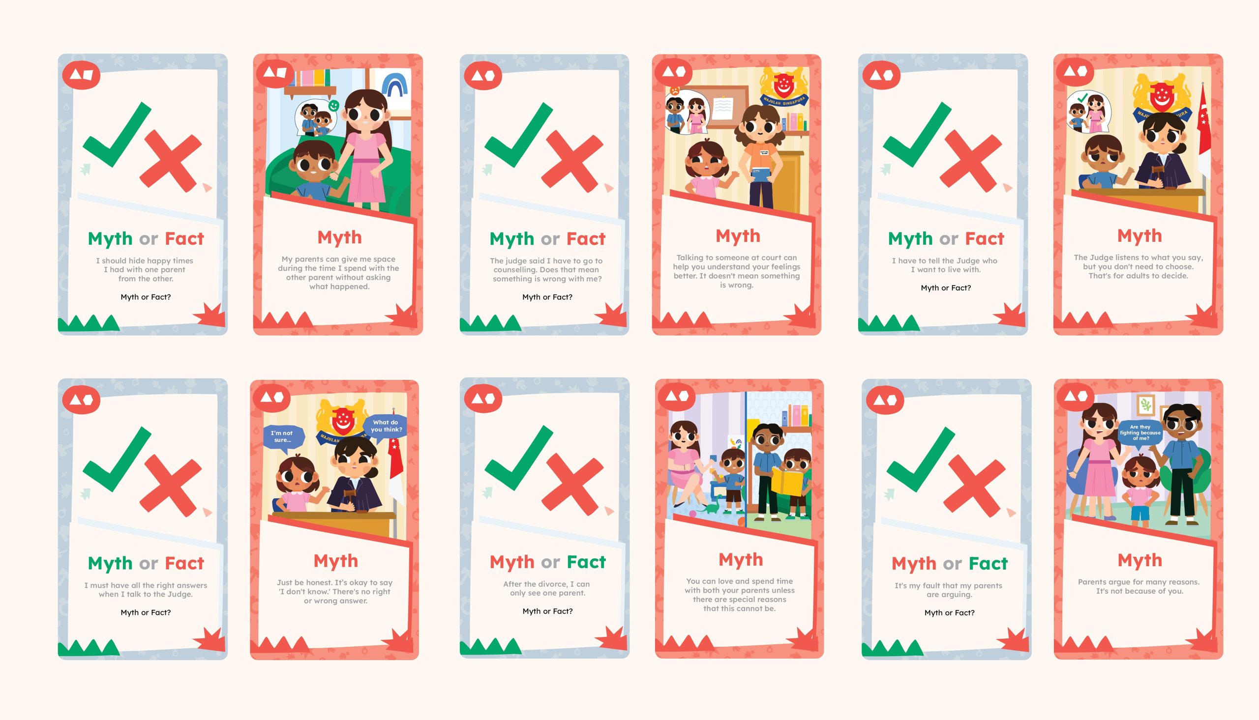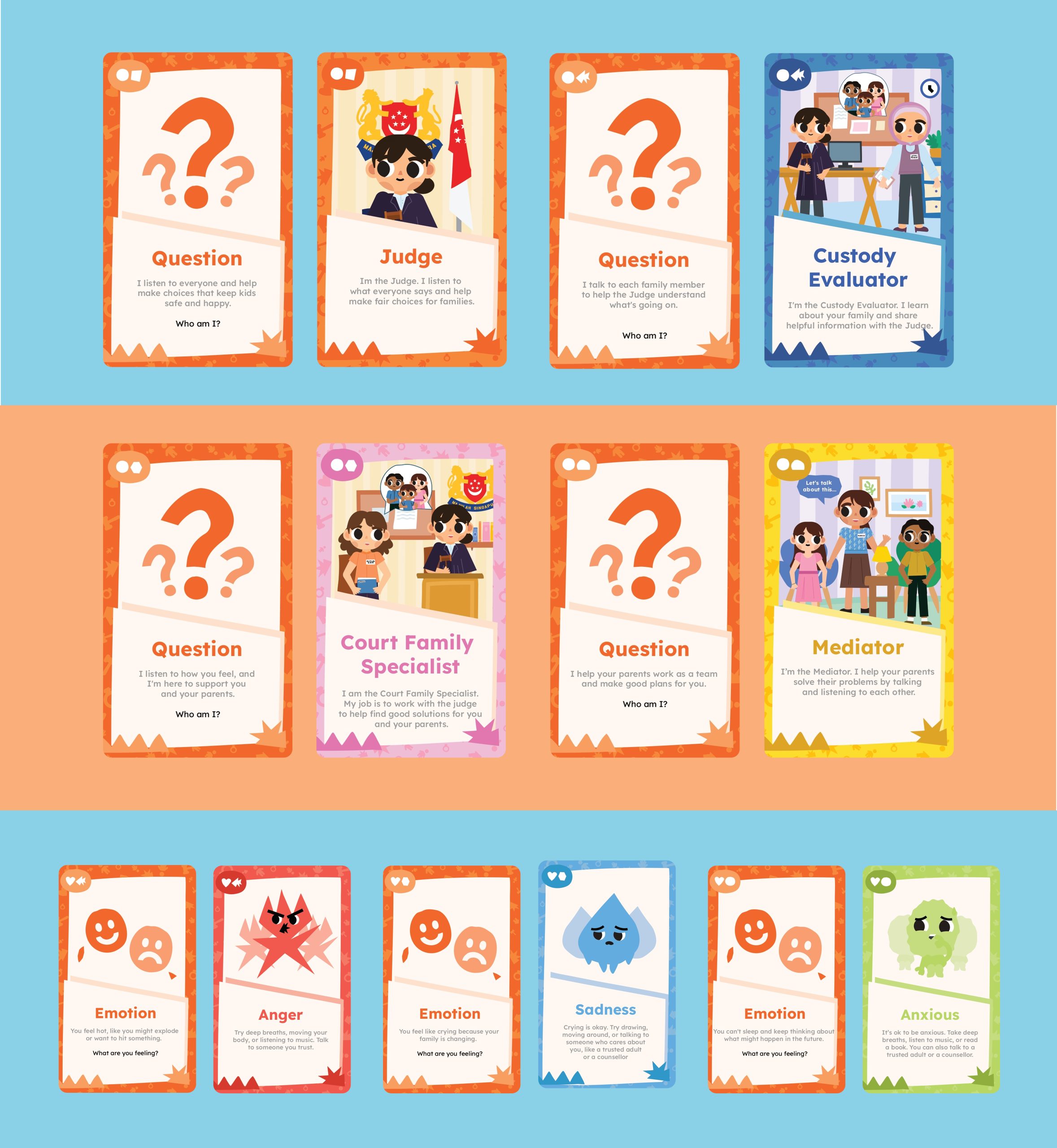 Question and Answer cards introduce different roles and situations within the Family Justice Courts through a simple question and answer format. Question cards provide clues about a character or situation, prompting players to think about who the person might be, while the corresponding answer cards reveal the role; such as a Judge, Mediator, or Custody Evaluator, and explain their responsibilities in clear, child-friendly language. This pairing helps children better understand the people involved in the court process in an engaging and interactive way. Emotion cards focus on helping children recognise and express their feelings during difficult situations such as family separation. Each card represents a different emotion; such as anger, sadness, or anxiety, and offers simple guidance on understanding and coping with those feelings.